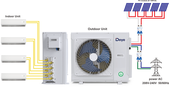 Eliminando la necessità di una batteria esterna, questo sistema integra un booster solare MPPT ad alte prestazioni e un inverter AC/DC a doppia modalità direttamente nella sua unità esterna centralizzata. La tecnologia MPPT garantisce la massima cattura dell'energia solare adattandosi dinamicamente alle fluttuazioni dell'intensità della luce solare, mentre l'inverter integrato consente il passaggio continuo tra l'energia solare CC e l'alimentazione CA della rete, dando priorità alla fornitura di energia rinnovabile per ridurre al minimo la dipendenza dalle reti elettriche tradizionali. Ideale per proprietà residenziali con più stanze o piccoli locali commerciali, offre un controllo della temperatura coerente e specifico per zona, riducendo al contempo i costi energetici complessivi e l'impronta di carbonio.